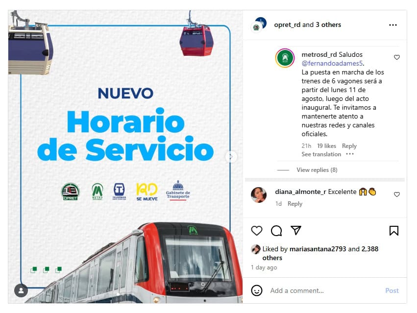 A partir del lunes 11 de agosto, el Metro de Santo Domingo comenzará a operar trenes de seis vagones como parte del plan de modernización y expansión del sistema, informó la Oficina para el Reordenamiento del Transporte (Opret) a través de sus redes sociales.