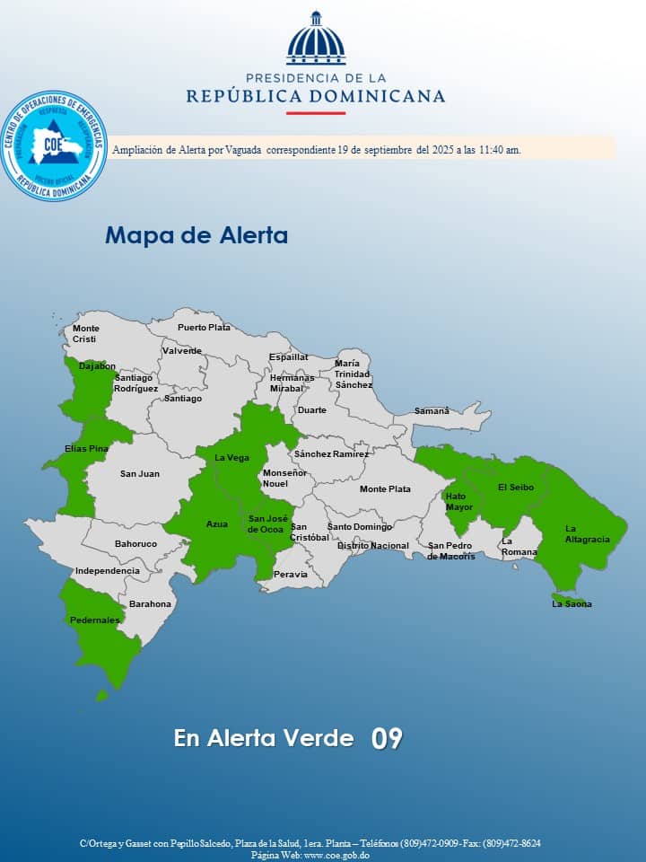 Las provincias que están en alerta verde son: La Altagracia, El Seibo, Hato Mayor, Azua, La Vega, San José de Ocoa, Elías Piña, Dajabón y Pedernales.