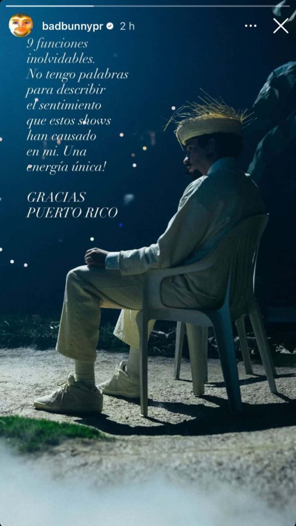 “Nueve funciones inolvidables. No tengo palabras para describir el sentimiento que estos shows han causado en mí. Una energía única! GRACIAS PUERTO RICO“, escribió el conocido como ‘Conejo Malo‘ en su historia de Instagram.