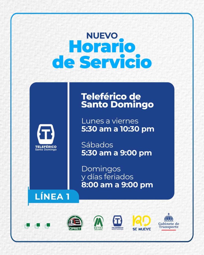De acuerdo con la Opret, a partir de esta fecha, el Metro de Santo Domingo y la Línea 1 del Teleférico (que cubre desde Gualey hasta la Charles de Gaulle) funcionarán en el siguiente horario