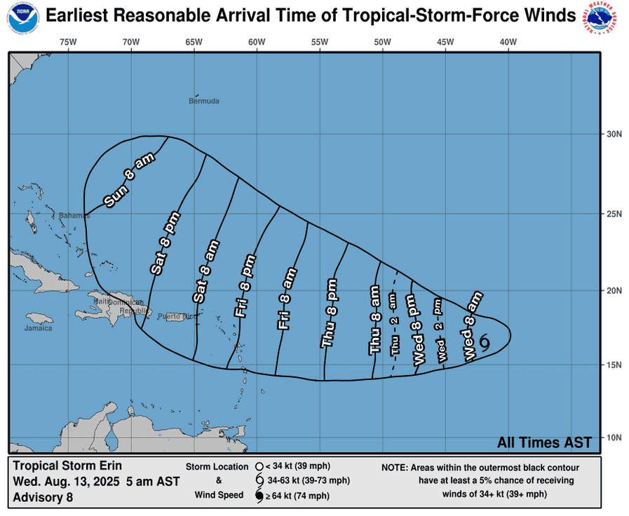 Según el CNH, las marejadas generadas por Erin comenzarán a afectar partes de las Islas de Sotavento del Norte, las Islas Vírgenes y Puerto Rico este fin de semana.