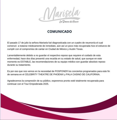 “Agradecemos la compresión de su público, esperemos pronto esté totalmente recuperada para continuar con el Tour Empoderada 2025”, dice en el texto.