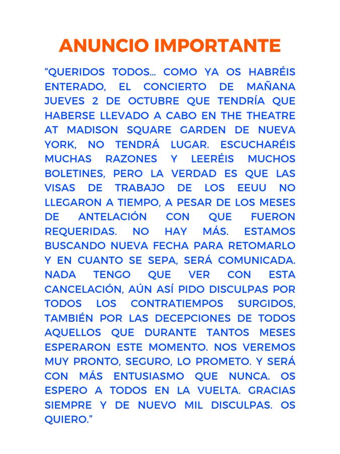 Bosé lamentó la situación y se disculpó con los seguidores que esperaban verlo en vivo en el escenario del The Theatre at Madison Square Garden. Afirmó además que ni él ni su equipo tienen responsabilidad en la cancelación, ya que cumplieron con todos los requisitos en los plazos establecidos.