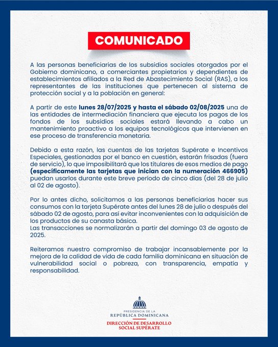 La Dirección de Desarrollo Social Supérate informó este jueves que, desde el lunes 28 de julio hasta el sábado 2 de agosto de 2025, las tarjetas Supérate y de incentivos especiales estarán temporalmente fuera de servicio, debido a un proceso de mantenimiento proactivo que llevará a cabo una de las entidades financieras encargadas de gestionar los pagos de los subsidios sociales.