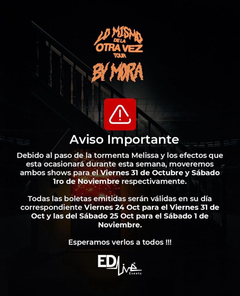 La empresa ED Live anunció este miércoles la reprogramación de los conciertos del artista urbano Mora en Santo Domingo, previstos para los días 24 y 25 de octubre en el Óvalo de la Feria Ganadera, debido a los efectos que provocará el paso de la tormenta tropical Melissa.