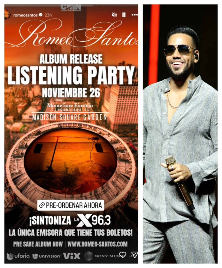 Romeo Santos anunció este lunes que celebrará un “listening party” de su nuevo álbum el próximo 26 de noviembre en el Madison Square Garden, en Nueva York. El evento, producido por Cárdenas Marketing Network Events, permitirá a los asistentes escuchar por primera vez las canciones que estarán disponibles oficialmente a partir del 28 de noviembre.